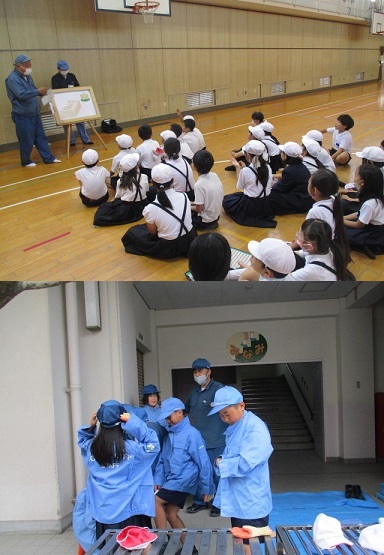 パッカー車がごみを収集する様子を見たり、車に貼ったクイズに答えたり、紙芝居や乗車体験、作業服を着用したりして2時間の体験学習をしました。