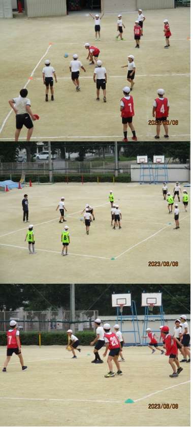 屋外スポーツクラブは、運動場でドッジボールをしています。4チームがリーグ戦で戦っています。毎回、普通のドッジボールとは違ったルールを自分たちで決めて行っています。今日は「王様ドッジ」でした。王様に当たれば終わりです。子どもたちは、誰が王様かばれないように気をつけながら、試合をしていました。