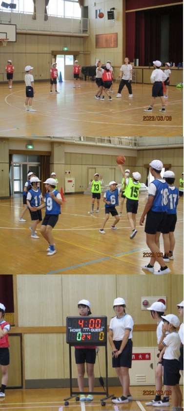 屋内スポーツクラブは、講堂でバスケットボールをしています。1チーム5人ずつ、1試合4分で行います。ゴールは上手にパスを回したりドリブルをしたりして、何度もゴールにチャレンジしていました。