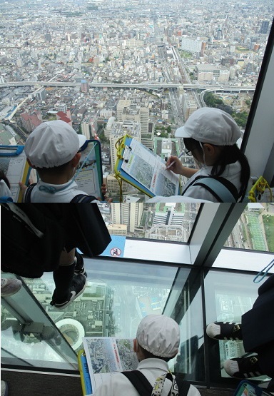 まずは、あべのハルカスの展望台に上り、地上300Mから東西南北の大阪の街並みを眺め、学習しました。