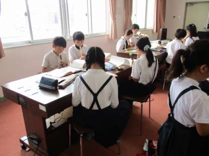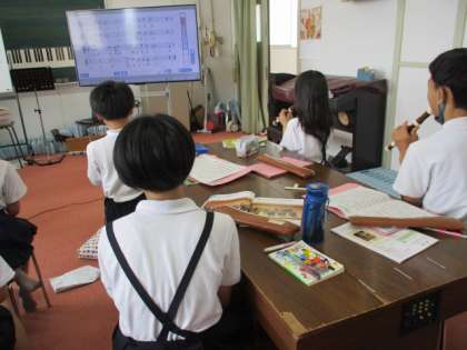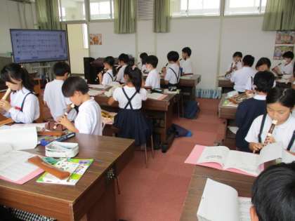 5年生がリコーダーの学習で「小さな約束」を練習しています。みんな、リコーダーのテストに向け、一生懸命です。指使いが難しい音や高い音もきれいにふけるよう、がんばっています。