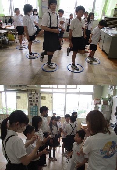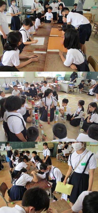 1班は「1分間で何文字書けるか」2班は「空き缶タワー」3班は「腕ずもう」4班は「しゃてき」5班は「ストラックアウト」6班は「ゴミ箱玉入れ」7班は「片足立ちチャンピオン」8班は「10秒ストップウォッチ」でした。