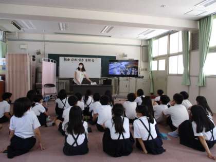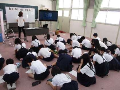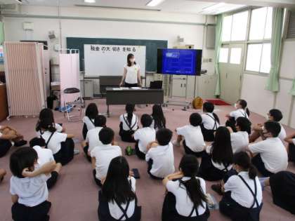税理士の方にゲストティーチャーとして来ていただき、税金の使われ方や税金の大切さの学習を行いました。税金がなくなった世界のDVDを視聴したり、クイズをしたりして理解を深めました。