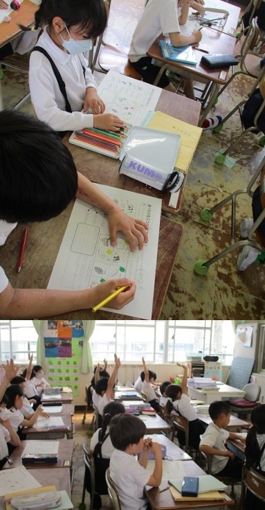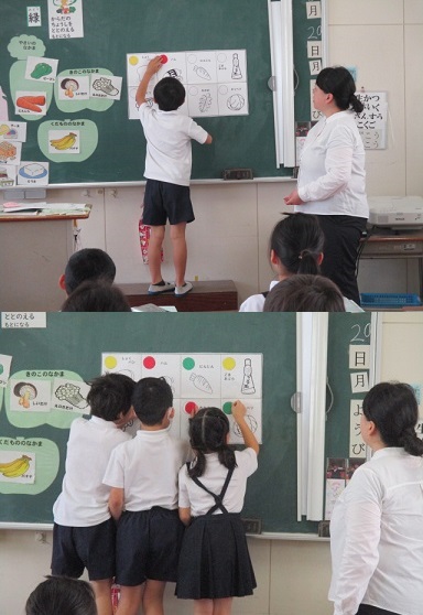 「食べ物を3つの色にわけよう」というめあてで、様々な食べ物を赤色(主に体をつくる)・黄色(主にエネルギーになる)・緑色(主に体の調子を整える)に種類分けする学習をしていました。