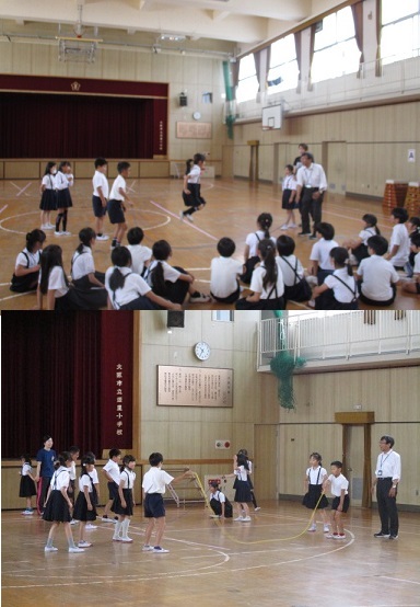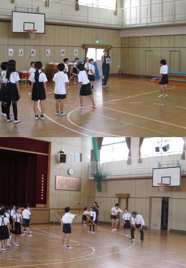 今日は3年1組の子どもたちが20分休みに講堂で、長なわとびで遊びました。