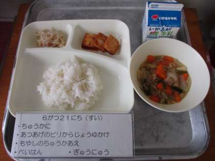 あつあげのピリ辛じょうゆかけは、あつあげを網なしホテルパンに入れ、蒸し焼きモードで焼きます。砂糖、こいくちしょうゆ、トウバンジャンを合わせて煮、配缶時にあつあげにかけます。正方形の一口サイズのあつあげで、見た目も可愛いく食べやすいです!