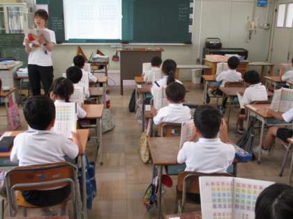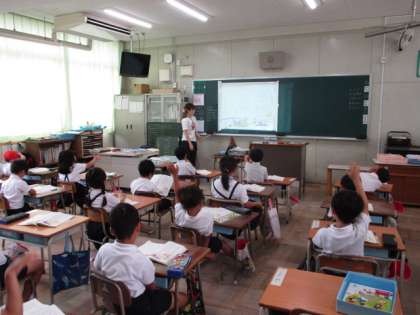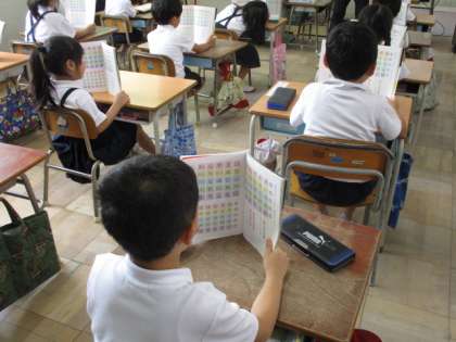 1年生の国語科の学習です。よい姿勢で国語の教科書を読むことができます。