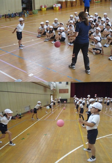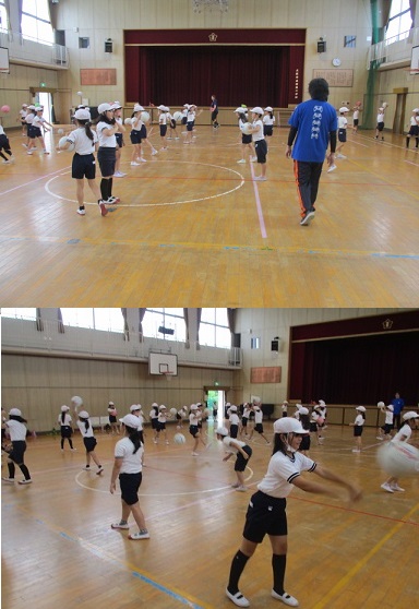 プレルボールはバレーボール型のゲームで、ボールを1回バウンドさせてパスをつないで相手コートに返すルールです。今日は、二人一組でワンバウンドさせてパスをする練習をしていました。