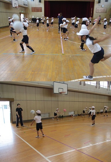 3年生が体育科の時間に、講堂でなわとび運動やプレルボールをしていました。