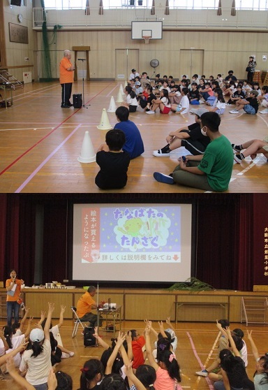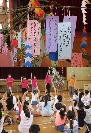 児童が83名参加し、七夕のお話やクイズ、短冊飾り、ゲームなど楽しい活動が行われました。天井には、子どもたちが作った天の川も飾られました。