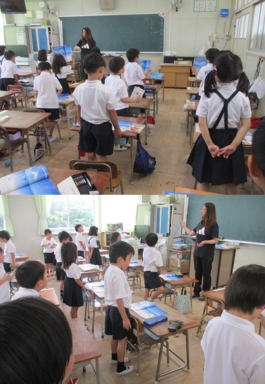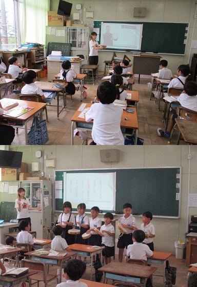 1年生が音楽科の時間、「うみ」の歌を歌ったり、「ぶんぶんぶん」の曲をタンバリンでリズム打ちしたりして楽しんでいました。