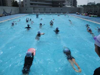 3年生もずいぶんプールに慣れてきました。今日は、水慣れのあと、25mを何度も泳ぎました。音楽をかけて、その音楽に合わせて泳いでいました。