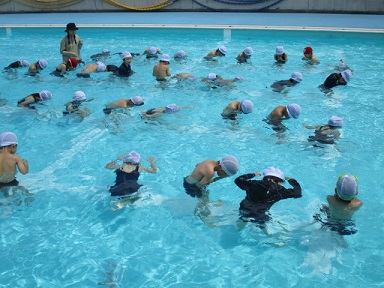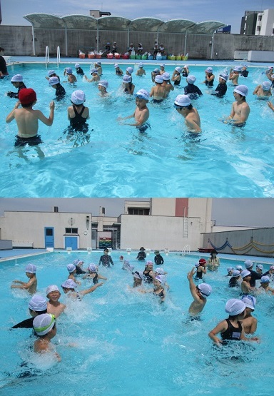 7月7日(金)1年生が体育科の時間に、プールで「水あそび」をしていました。