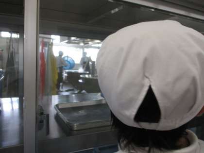 「きゅうしょくしつをたんけんしよう」の第2弾として、今日は1年2組の児童が給食室へ行って、児童だまりから調理員さんが作っている様子を見学しました。