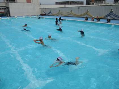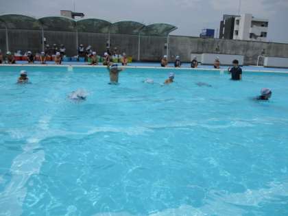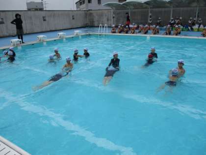 1年生がプールで「水遊び」の学習を行いました。水の中でジャンプをしたり、ペアになり水の中で引っ張ってもらったり、水遊びを楽しんでいました。