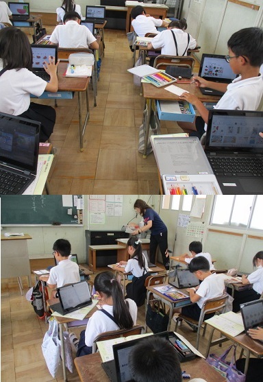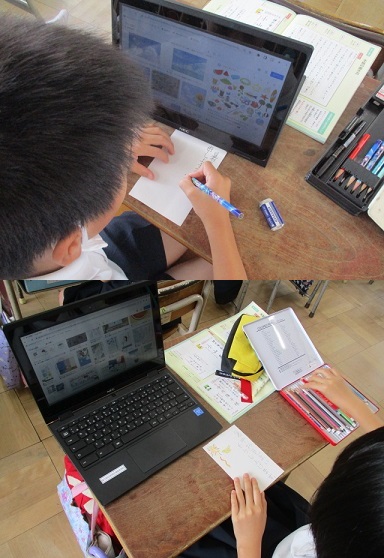 届ける人を決め、メッセージを考えたり、夏らしいイラストをクロムブックを使いインターネットから探したりしていました。