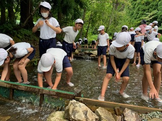 冷たい川に足をつけ、一生懸命にアマゴやヤマメを捕まえました。