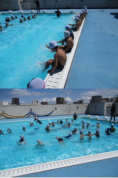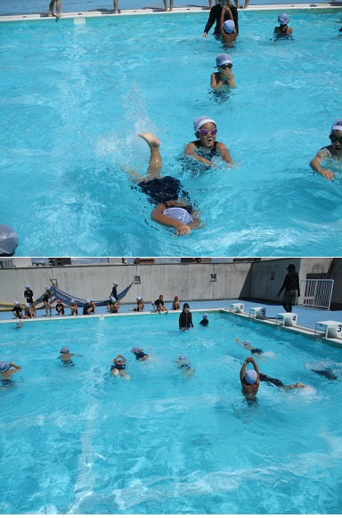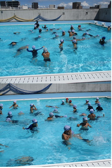 1年生が「水あそび」をしています。水にも慣れ、クラゲ浮き、だるま浮きなど、上手になりました。けのびやバタ足の練習もしました。最後に、バタ足で何メートル泳げるか、測りました。途中で何度もお茶休憩を取りながら、安全に気をつけて泳ぐことができました。