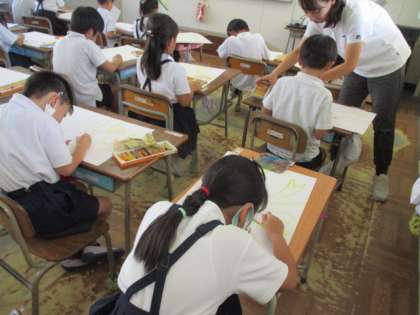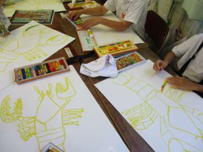 2年生が図画工作科の時間「カラフルなザリガニ」を描いていました。黄色の線をつかって下絵をつくり、パスでいろいろなを塗っていました。