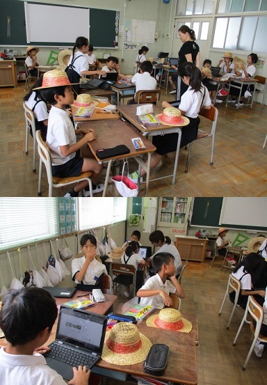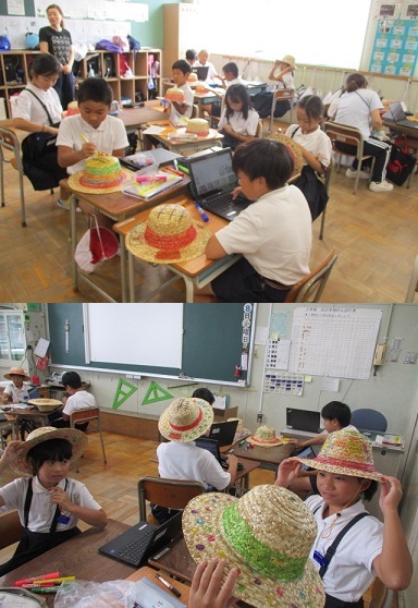 4年生が図画工作科の時間に、「麦わらぼうしをデザインしよう」の学習に取り組んでいました。