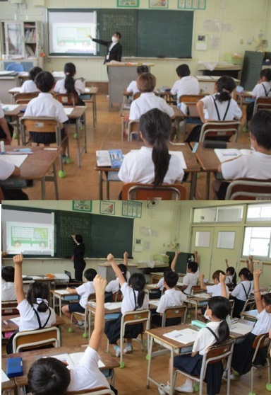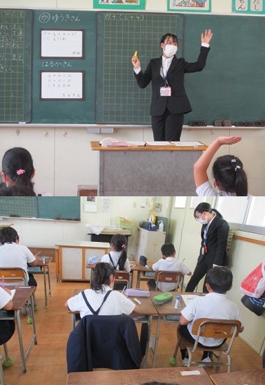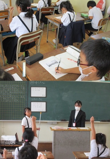 2年生が算数科の時間に、教育実習の先生と「( )を使った式」について学習していました。
