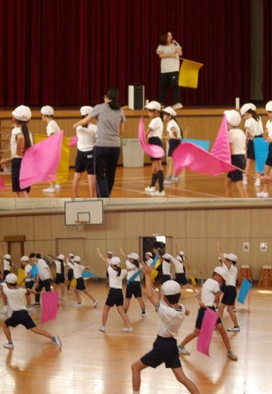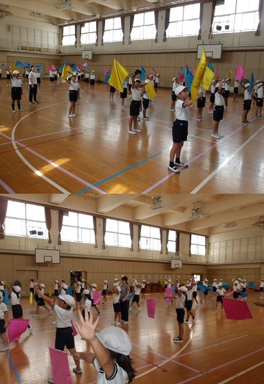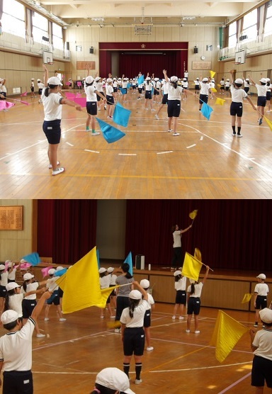 4年生が体育科の時間に、運動会でする旗を使ったダンスの練習をしていました。