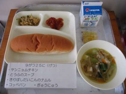 本日は韓国朝鮮の料理献立、ヤンニョムチキンです。ヤンニョムとは、調味料や味つけするという意味です。給食では、コチジャン、こいくちしょうゆ、ケチャップ、料理酒、みりんで作ったタレをしょうが、にんにくで下味をつけ、揚げた鶏肉にからめています。衣にタレがしみこんで、噛むと、サクッ、じゅわーです。こども達も大喜びでした!!