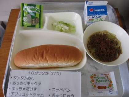 本日は、タンタンめんです!タンタンめんは、豚骨スープ、塩、こしょう、こいくちしょうゆ、すりごま、ラー油が入ったスープに、にんじん、チンゲンサイ、もやし、かためにゆで、さっと水にさらした中華めんが入っています。配食時に、その上に砂糖、こいくちしょうゆ、テンメンジャン、赤みそで、味をつけた豚ひき肉と牛ひき肉をのせます。