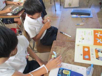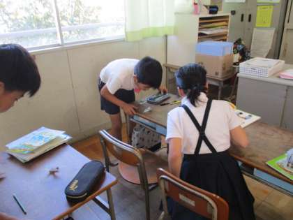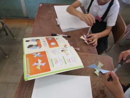 3年生が今日から算数(下)の教科書の学習を始めました。最初は、「ふきこまをまわそう」です。教科書の最後についている「ふきこま」を切って組み立て、息を吹きかけて回します。次の「円と球」の学習につながる楽しい時間でした。