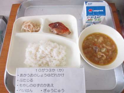 もやしのゆずの香あえは、もやしをゆで、砂糖、米酢、うすくちしょうゆ、ゆずを合わせて煮、配缶時にもやしにかけ、あえます。食べると、ゆずの香りがふわっと香り、米酢で後味さっぱりです!今日は、1、2、3年生の教室で、もやしのクイズやお話しをしました。