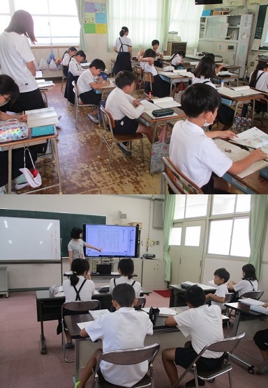 教科書の3つのもとになる絵から、「始まり」「山場」「終わり」の組み立てで物語を設定し、今日は大きな変化が起きる山場の出来事を一人一人が考えていました。