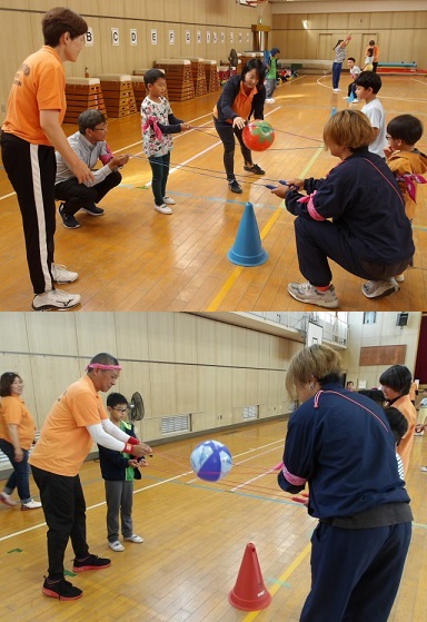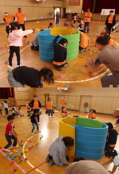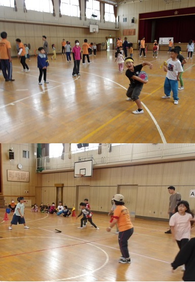 育成会のスタッフの方が進行される中、子どもたちが3種類のニュースポーツを4チームに分かれ楽しみました。