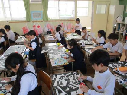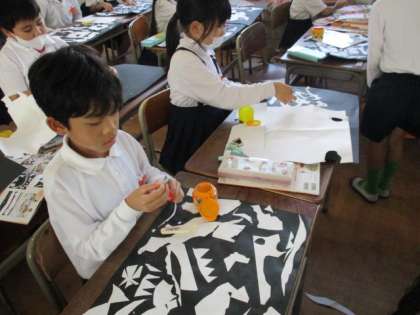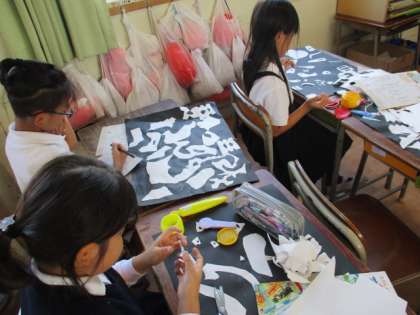 2年生が、「はさみのアート」に取り組んでいました。はさみで白い画用紙を切って、黒い画用紙に貼っていきます。何かの形を決めて切るのではなく、偶然できた形から「何に見えるかな」と、想像を広げていきます。黒い画用紙いっぱいに様々な形が出来上がりました。