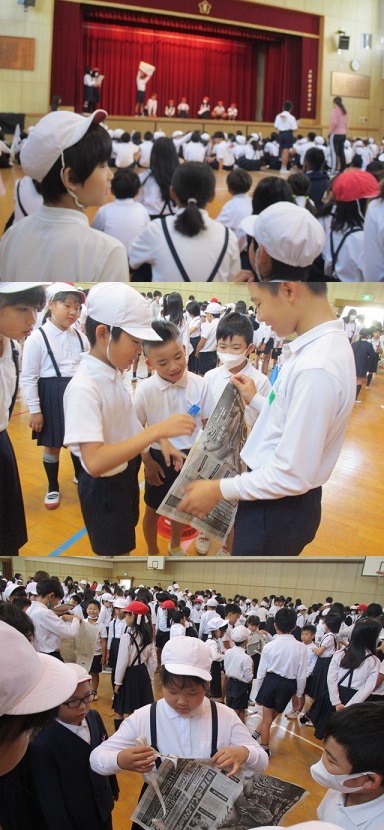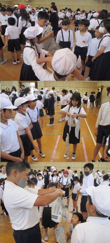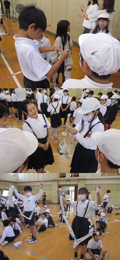 今日のゲームは「新聞かわむきゲーム」でした。ひめっ子班ごとに新聞紙を1枚ずつ渡され、一人10秒ずつで新聞紙をちぎれないように裂いていき、どれだけ長くできるか挑戦するゲームでした。