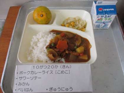 サワーソテーは、綿実油を熱し、コーン、キャベツの順にいためる。いたまれば、砂糖、塩、ワインビネガー、うすくちしょうゆで味つけします。今日は、音楽鑑賞会があったので、給食をとりに来る時に、みんな目を丸くして、「よかった♪」「めちゃめちゃ、楽しかったー♪」と、ニコニコ笑顔で感想を教えてくれました!!