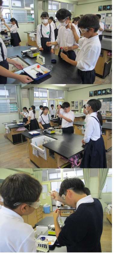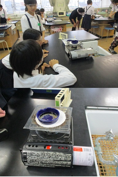 6年生が理科の実験に取り組んでいます。今回は「見えなくなった金属のゆくえ」で、塩酸に鉄やアルミニウムを溶かした液体を蒸発させます。蒸発皿に液体を入れ、コンロにかけると液体が蒸発し、そこに残った個体を観察しました。子どもたちは保護メガネをかけて、班で協力しながら真剣に実験をしていました。
