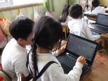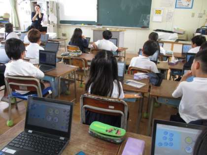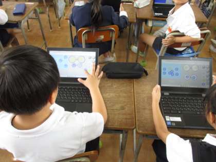 2年生がプログラミングの学習をしました。「ビスケット」というアプリを使いました。自分の描いた2つの絵がぶつかると別の絵になるというプロブラムをつくることができました。