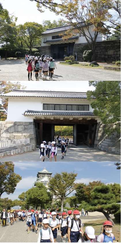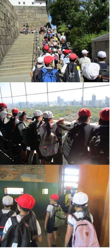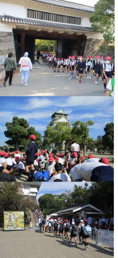3年生と5年生が遠足で一緒に大阪城公園に行きました。大阪城公園では3年生と5年生がグループで活動しました。初めに天守閣を見学しました。