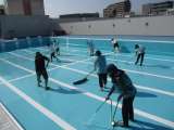 跳び箱は場所がわかりやすいように四角くテープを貼った中に置き、15台の大小の跳び箱が整備されています。