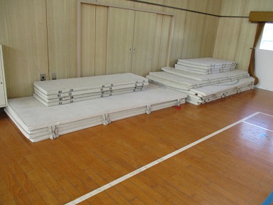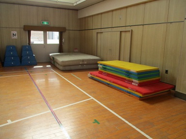 講堂には、跳び箱やマットなど体育用具が並べられています。