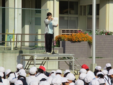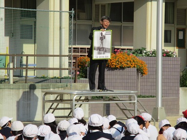 次に、校庭の隅にある銅像の「二宮金次郎」についてどんなことをした人物かを話しました。