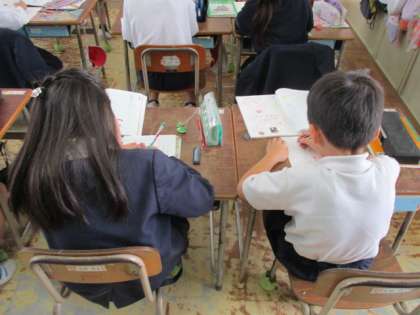 2年生の国語の学習のようすです。身近な人がすることをテーマに「〇〇が□□。」という文をたくさん作りました。