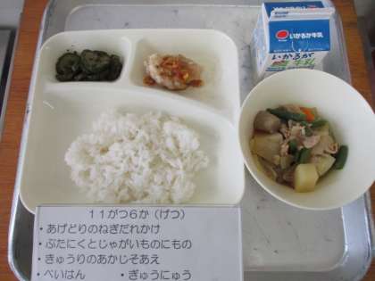 あげどりのねぎだれかけは、鶏肉を料理酒、しょうが汁で下味をつけます。鶏肉のつけ汁をきり、でん粉をまぶし、熱したなたね油で揚げます。白ねぎ、砂糖、米酢、こいくちしょうゆ、湯を合わせて煮、火を止め、ごま油を加え、配缶時に鶏肉にかけます。カリカリジューシーな鶏肉に、甘酸っぱいタレがよくからんで美味しいです!