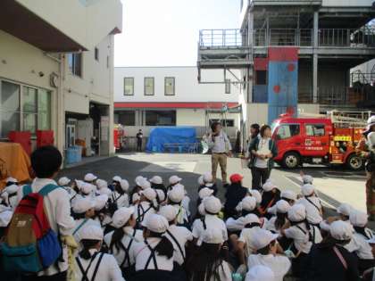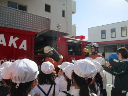 3年生が社会見学で西淀川消防署に行きました。消防車の中の道具を見たり、実際に煙の中をくぐったり、消火器を使ったりしました。消防署さんのお話もたくさん聞くことができました。