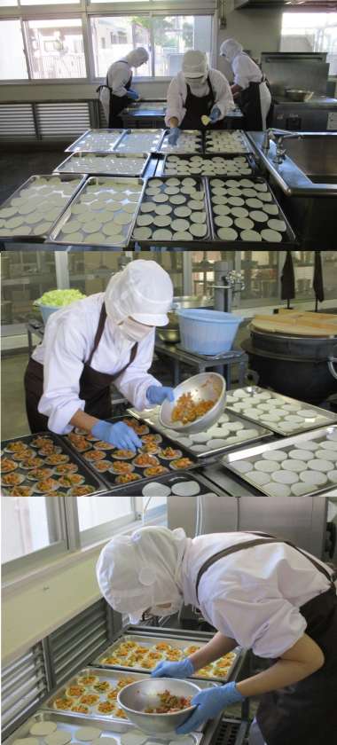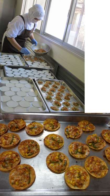 年1回のかわりピザの日です!ぎょうざの皮を使用しています。ホテルパンに1枚1枚並べて、ツナ、コーン、ピーマン、ピザソース、チーズを混ぜ合わせた具をのせ、焼き物機で焼きます。1枚1枚、調理員さんの手作業で作ってくださっています!