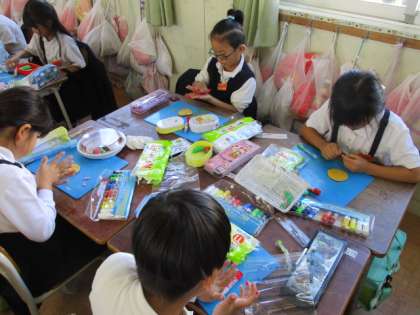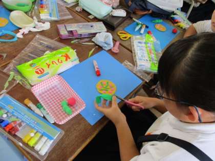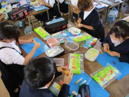 2年生が、作品展に向けて紙粘土をつかってお弁当づくりをしています。はじめは粘土に絵の具をぬりこむのが難しかったけれど、徐々に慣れてきて上手にできるようになっていきました。