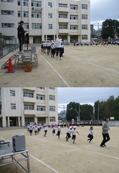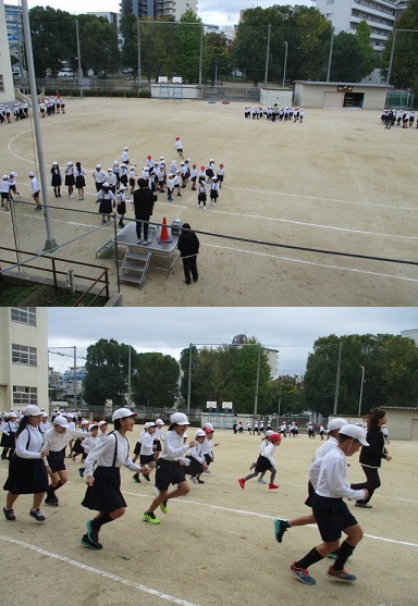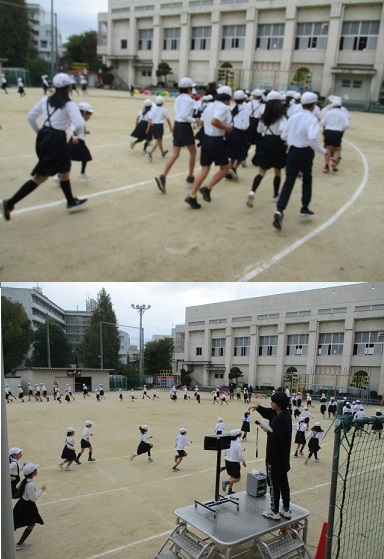 2時間目と3時間目の間の20分休みに2つの学年が一緒に走ります。