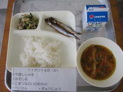 こまつなのいためものは、綿実油を熱し、ささみ(油漬け)、まいたけの順にいためます。いたまれば、下ゆでしたこまつなを加えていため、砂糖、うすくちしょうゆ、こいくちしょうゆで味つけします。ささみがあることで食べやすく、まいたけと小松菜の食感が楽しめます!今日は、4年生の教室でお話しとクイズをしました!