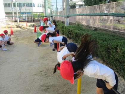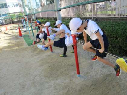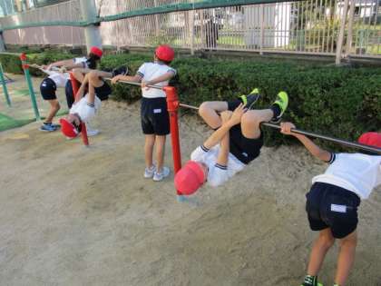 2年生が体育の学習で鉄棒に取り組んでいました。前回りや逆上がりや足かけあがりなどの技に取り組んでいました。