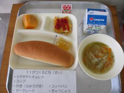果物には、秋の味覚、富有柿も登場しました!今日は1年生の教室で柿のお話しとクイズをしました。